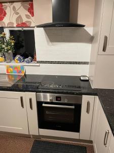The apartment includes two bedrooms equipped with comfortable beds and carpeted floors. Guests will appreciate a well-appointed bathroom featuring a walk-in shower, bathtub or shower options, complimentary toiletries including shampoo and body soap. A fully equipped kitchen contains an oven, stovetop, refrigerator, microwave, toaster and electric kettle alongside kitchenware for convenient dining.